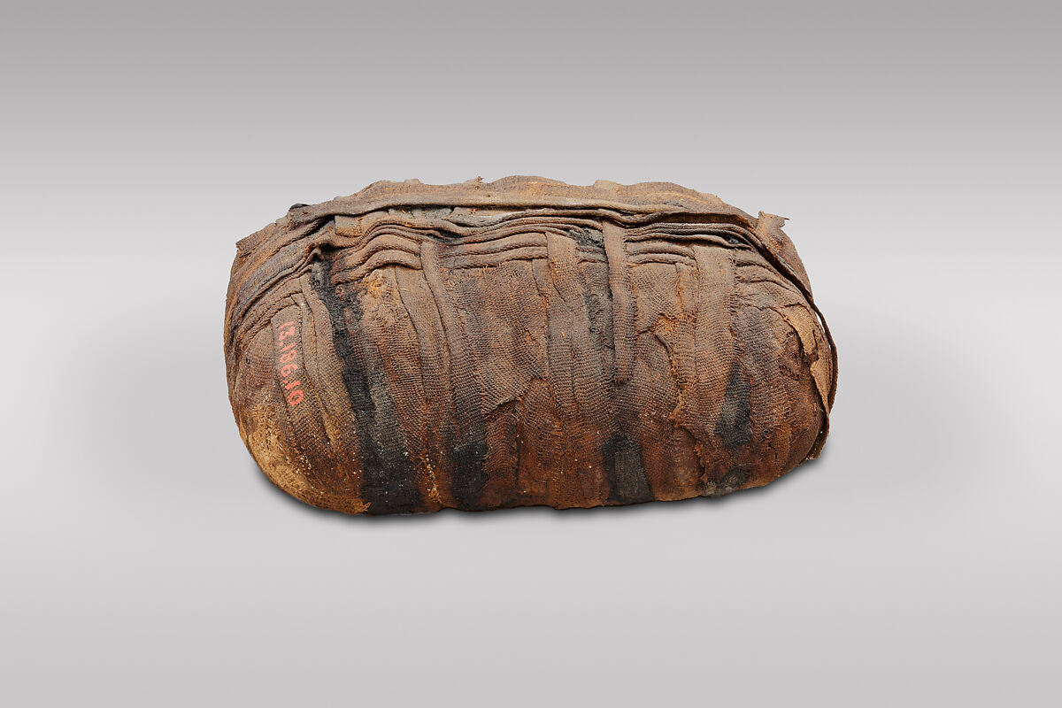 This wrapped packet was found at Abydos in the same area as 13.186.4a-c. Recently a review of the museum's animal mummies and their x-rays was conducted in consultation with an expert in their study, and brought to light a number of interesting points. The wrappings of this bundle consist of strips of rather coarse linen woven to create a geometric pattern. Inside the bundle are the mummies of approximately twelve shrews. Shrews are connected with a manifestation of the sun god, and by extension, the king.
