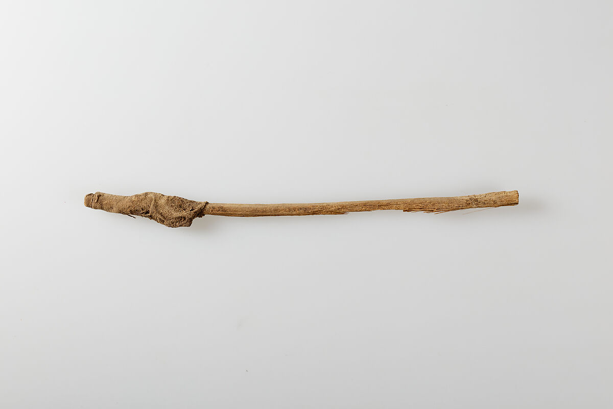 Discovered in a cache of embalming eqiupment in the Theban necropolis, this swab consists of a palm stick with a wad of linen textile twisted around one end. The rag is oily and caked with natron, and was very likely used during the embalming process.