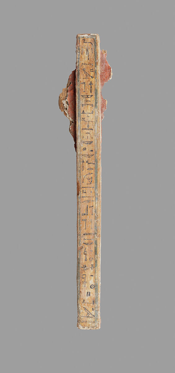 One of three fragments found together, this may be part of the frame of a miniature shrine. The inscription is a spell asking that the sun god, Re-Harakhty, give offerings to the ka (spirit) of a priest of Montu named Padihor.