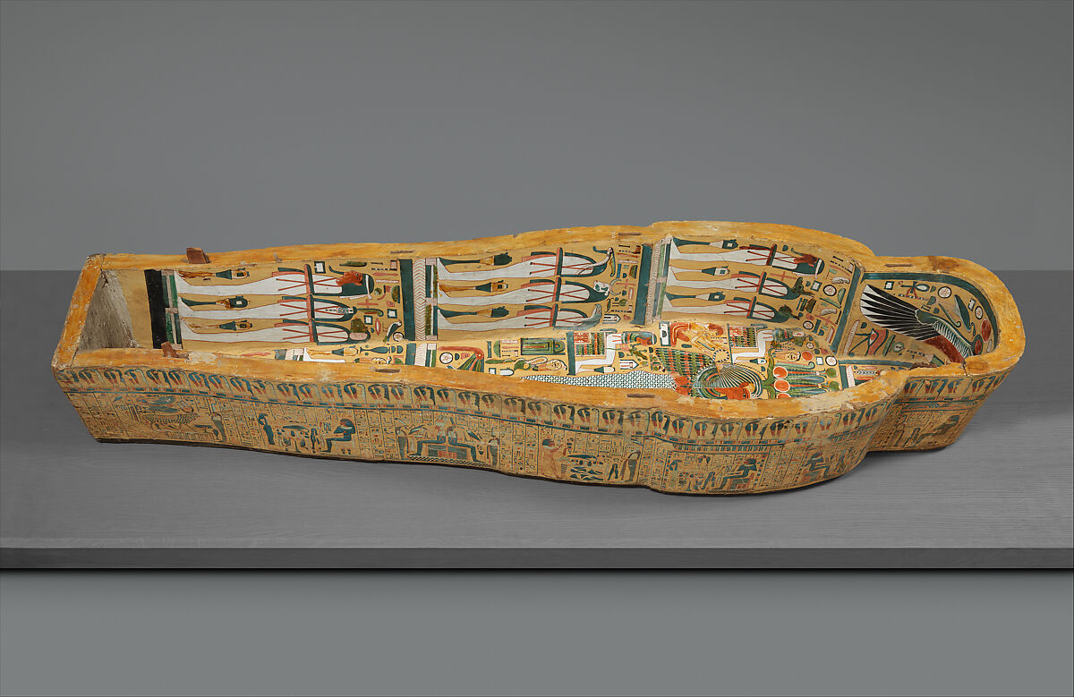 The figures on the interior of this finely decorated wooden coffin from the Third Intermediate Period are painted in a detailed, colorful style. In the center of the box interior stands the deified King Amenhotep I in the guise of the mummiform Osiris attended by a priest in a panther skin, a human-headed ba-bird (presumably the spirit of the coffin's owner), and a crouching mourning woman. Funerary vignettes, including the deceased (shown in some instances male and in others female) before various gods and images of Hathor as a cow emerging from the mountain, decorate the exterior. There is no mention of the owner's name among the many inscriptions.