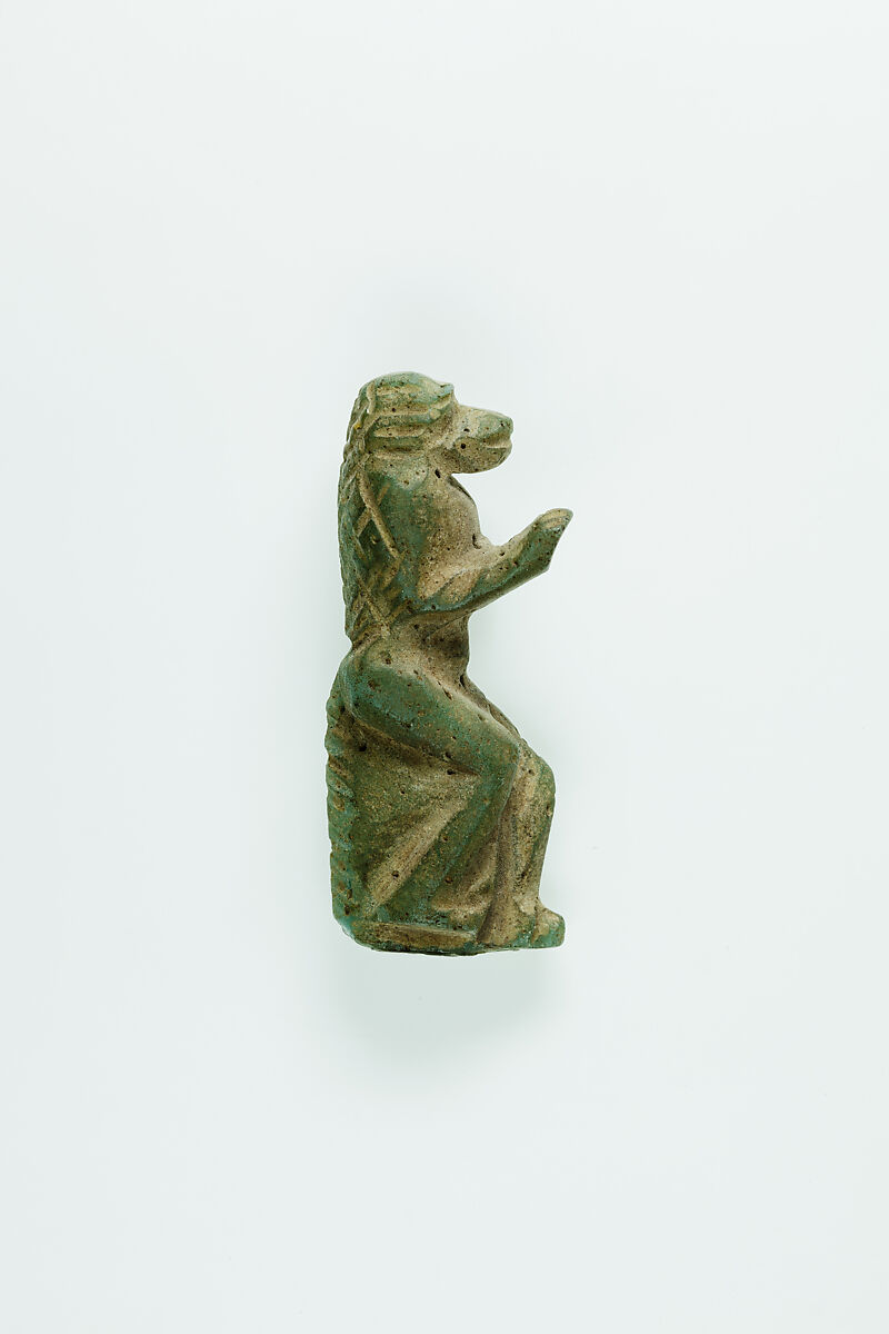 This small figurine depicts a baboon standing on its hinds legs with its arms raised. Baboons often stretch and chatter with the first morning light. Since standing with one's arms raised was an ancient Egyptian gesture for adoration, baboons in this position were seen as greeting and adoring the sun.