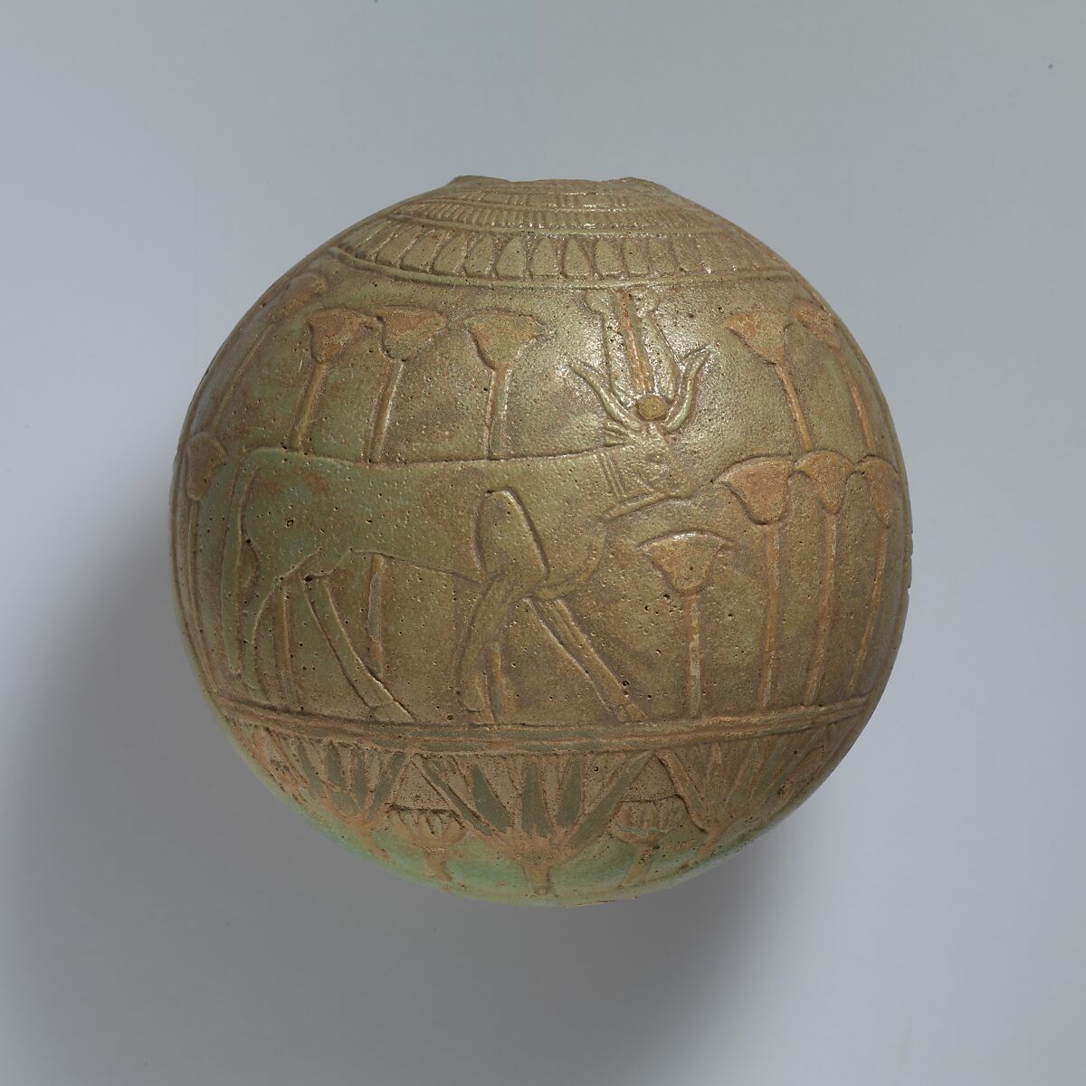 Relief-decorated faience vessels of the first half of the first millennium B.C. form a distinctive group. The scenes they exhibit are drawn from a set of interconnected cycles mainly having to do with divine and royal rebirth and great female goddesses, mythological events that were filled with meaning for society's continuity and prosperity. As the inscription on a band around the contour of this vessel indicates, these themes were evoked at the transition to a new year, which in Egypt occurred when the Inundation began to cover the land and the success of the coming growing season was in the balance.