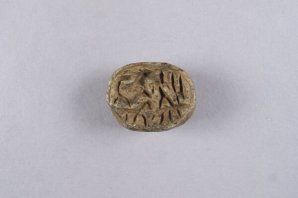 This example shows an animal with long, straight horns, possibly an oryx, followed by a pair of lions. A human stands on the horned animal’s back. The figure most likely represents the god Reshef, a Canaanite deity who was introduced in Egypt during the New Kingdom (ca. 1295-1070 B.C.) and who is often represented standing on a horned animal.
