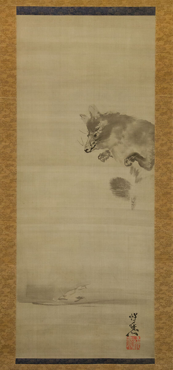 Although this image has traditionally been identified as a fox, which is a subject the artist frequently depicted, the shape of the animal’s face and the end of its tail indicates that was more likely meant to depict a tanuki, or Japanese raccoon dog. Both the fox and tanuki are celebrated in Japanese lore Caught in mid-leap as it gazes at a sketchily delineated and ambiguous form, the beast envisioned here recalls the tanuki’s fabled power to assume diverse transformations, frequently that of a beautiful woman, and to beguile the unwary.