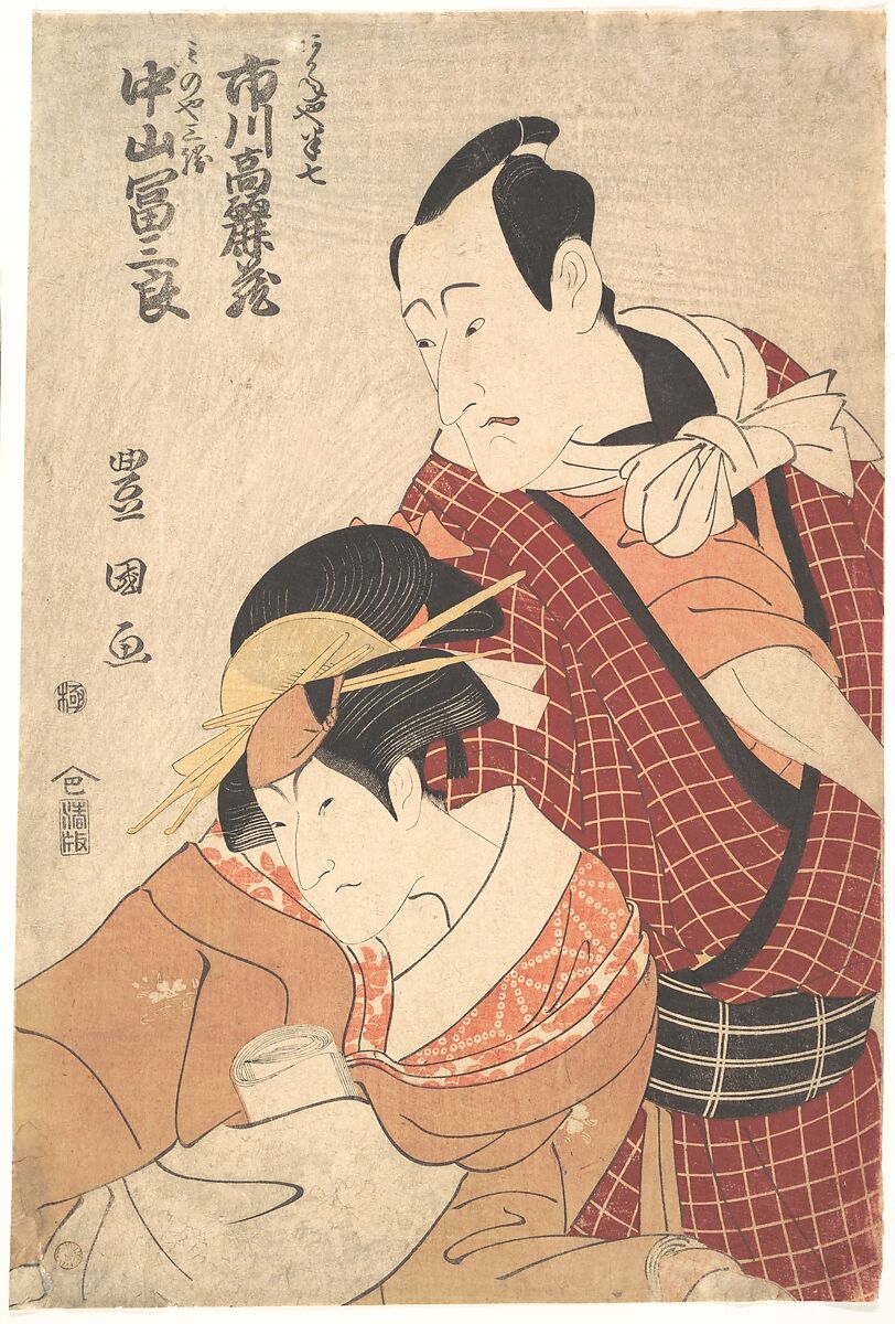 This print shows the tension of a couple's hopeless relationship. The character of the courtesan Minoya Sankatsu holds the letter she and her lover Akaneya Hanshichi wrote to his family as part of their preparations for double suicide. Ichikawa Komazō II (Matsumoto Kōshirō V) played the role of Hanshichi, Nakayama Tomisaburō (1760–1819) the role of Sankatsu.