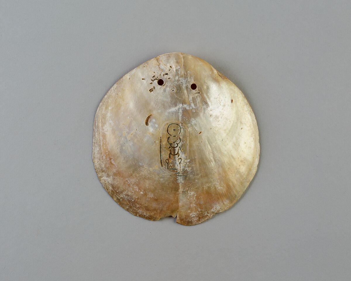 Polished down to its inner layer of nacre (mother of pearl), this iridescent oyster shell has been pierced with two holes so that it could be strung and hung around the neck. The royal name Senwosret has been incised into the surface. It is one of about fifty such shells known, most inscribed, like this example, with the nomen (birth name) Senwosret, or with the prenomen (throne name) Kheperkare. Since Kheperkare is the throne name of Senwosret I, it is generally assumed that it is this king (rather than another of the monarchs with the same name) who is meant here.