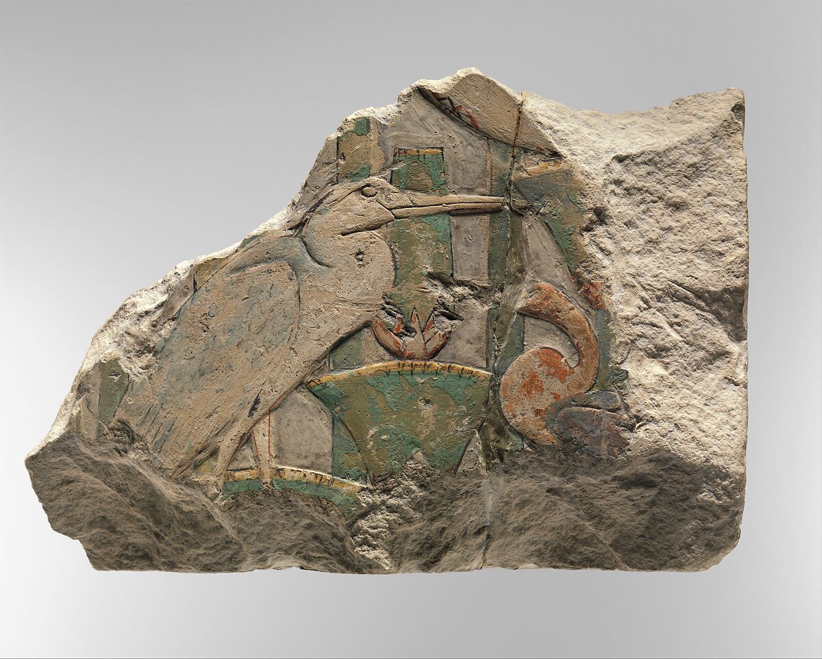 This exquisitely carved and delicately painted relief shows a gray heron and another bird, possibly a purple heron, perched within a mass of papyrus plants. In the upper right, the curved form with painted X-marks likely represents a nest that contained either baby birds or a mother sitting on eggs, both of which are common vignettes in marsh scenes. Originally part of a larger tableau, the small fragment is jewel-like in its fine detail.