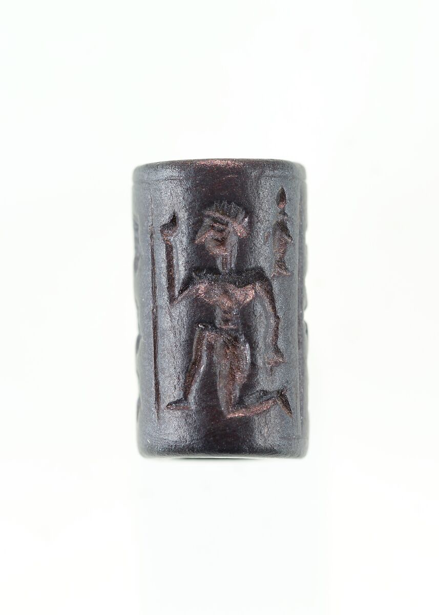 Cylinder seal carved with kneeling male figure with crest, human heads, horned animals, and birds.