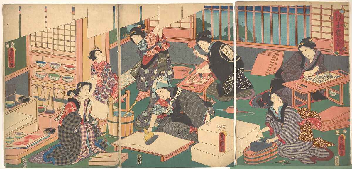 To represent artisans, one of the four classes (warriors, farmers, artisans, and merchants) of the Edo period, Kunisada replaced the men more typical of the theme with pretty women and illustrated the interior of a woodblock printer's atelier. The woman at a table at the right is incising fine lines into a woodblock through a sheet of paper bearing an artist's painted design. In the center near the window, another woman is using a gouge and mallet to remove unwanted wood from another block. The woman in the center foreground is applying sizing to a sheet of paper. At the left, in front of a printing alcove, a female printer is waiting for these preparations to be completed.