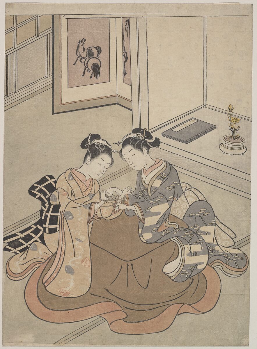 - Title: Two Young Women Seated by a Kotatsu Playing Cat's Cradle
