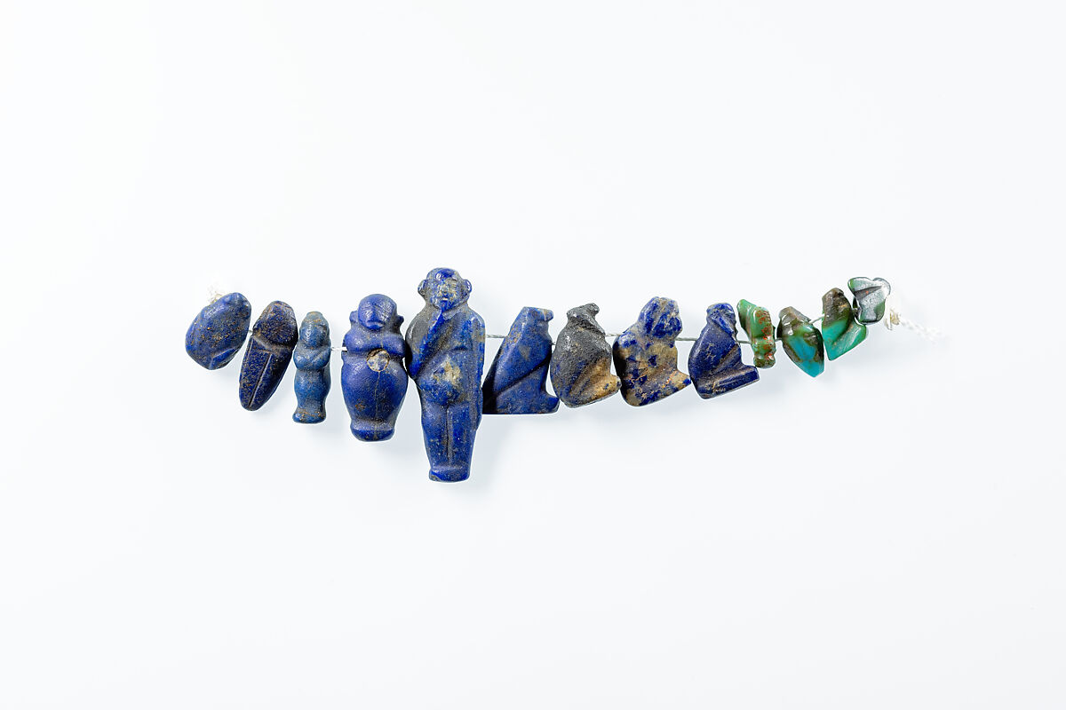 The piece is part of a group of objects found in tomb V21 at Abydos with two bodies. It was strung with other pieces in the Museum. The group includes 04.18.1–04.18.49.