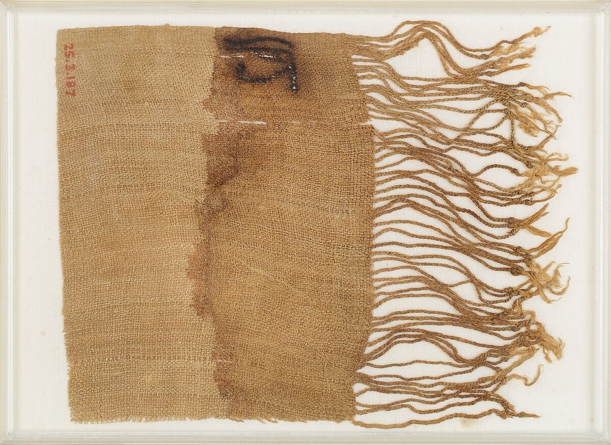 Henettawy's unembalmed body was wrapped in bandages of fine linen, inscribed in places with protective emblems. This fringed square bears a wedjat, the healed eye of Horus, roughly drawn in ink. Wounded in battle and then made whole again, this eye was a potent symbol of regeneration. In this context, it indicated that the linen was of very fine quality.