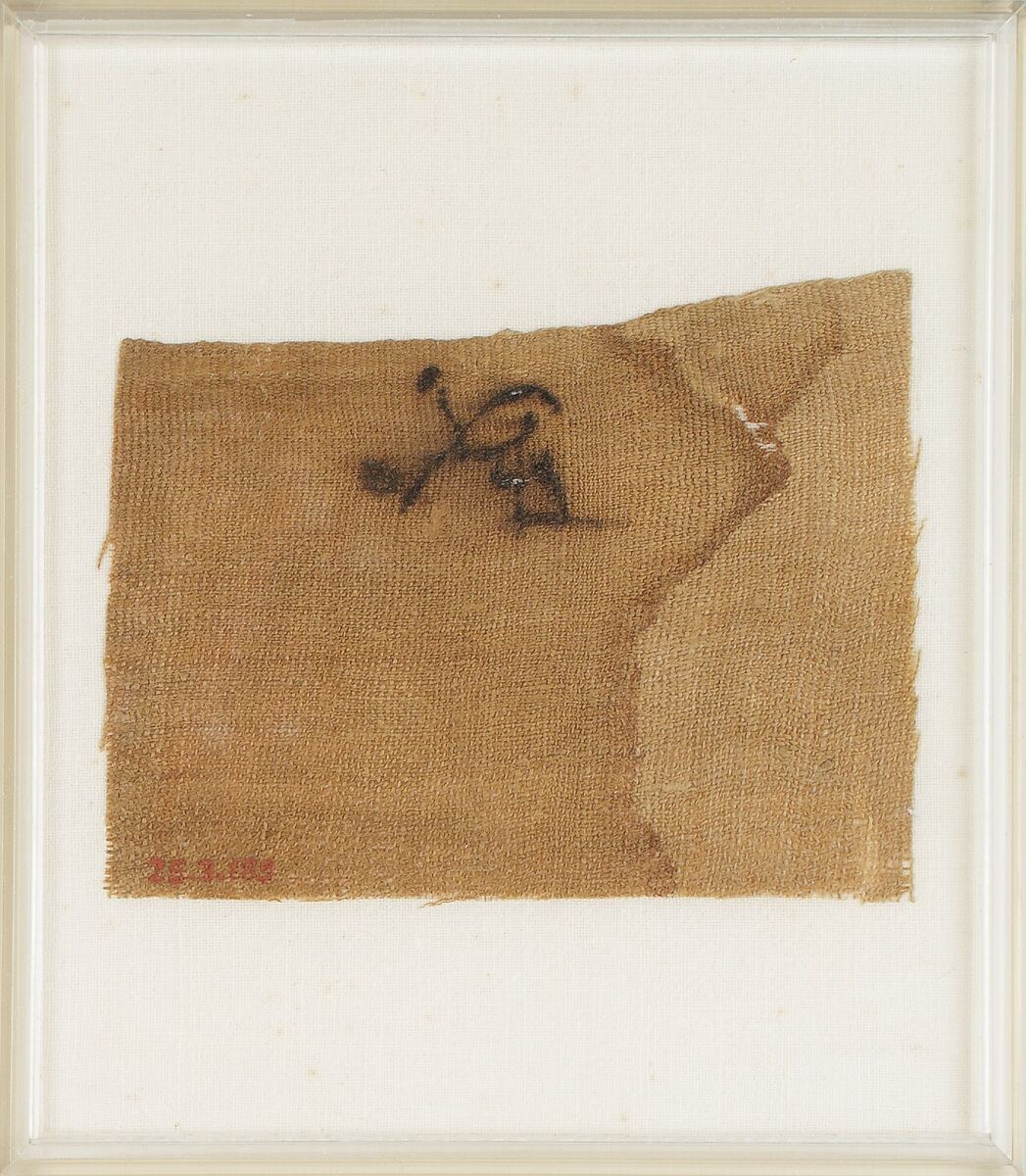 Henettawy's unembalmed body was wrapped in bandages of fine linen, inscribed in places with protective emblems. This fringed square bears the figure of a falcon holding a flail, a sign used previously for royal linen and an indication of high quality.