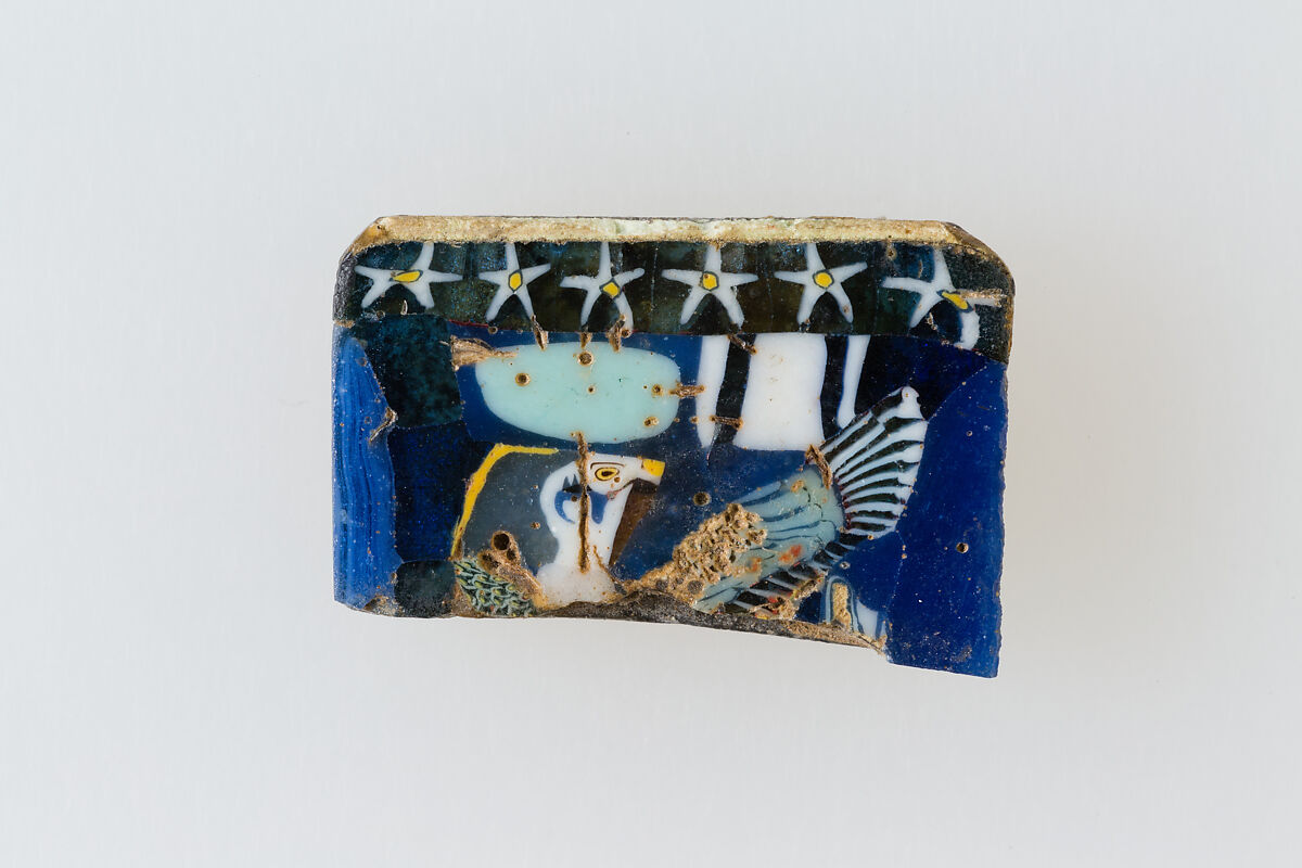A mosaic glass technique allowed multiples of an image to be created: a figural or design composition was made by bundling colored glass canes, which were then drawn out into a long bar. The bar was then sectioned at right angles, probably by striking the bar with appropriate tools, to produce small inlay tiles. The tile would then be smoothed and polished on the face intended to appear outwards.