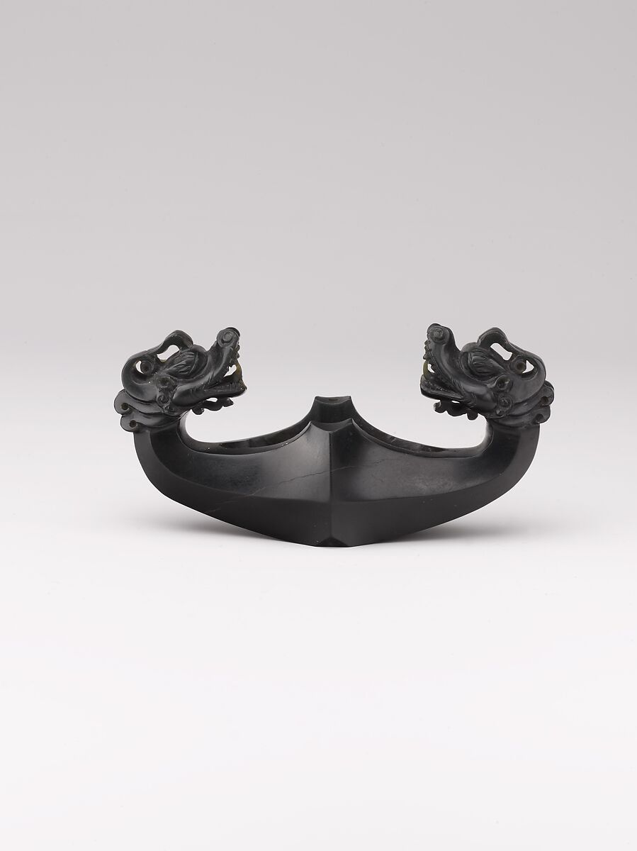Timurid royalty admired the qualities of nephrite (jade). The carved pieces that survive from the period include engraved rings and at least two dragon-handled white jade jugs. Also, at least two jade dragon-headed sword guards are known, including this example, created from the finest and rarest type of nephrite—black jade. Known for its hardness, jade is extremely difficult to carve, underscoring the exceptional quality of this highly detailed carving of confronted dragon heads with protruding tongues.