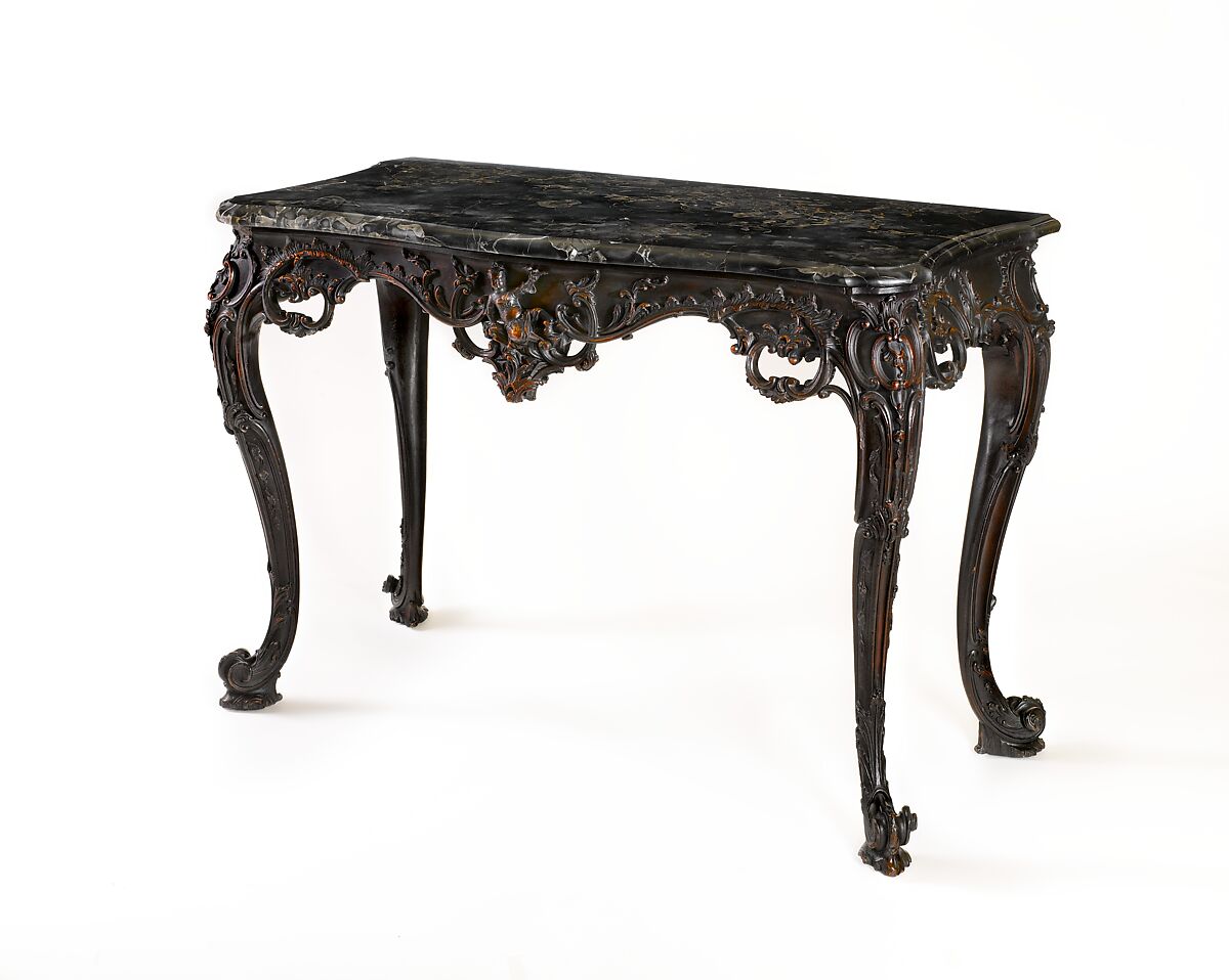 This is probably one of the two “marble slabs” purchased by General John Cadwalader (1742–1786) at an auction in 1769 for use in his house on Second Street, which he furnished with an ornateness unparalleled elsewhere in Philadelphia. In their plasticity, the unbroken serpentine curves of the legs and skirt rail are fully in the spirit of the French Rococo. However, the brilliant naturalistic carving is purely English, probably the work of a London-trained carver just arrived in Philadelphia.