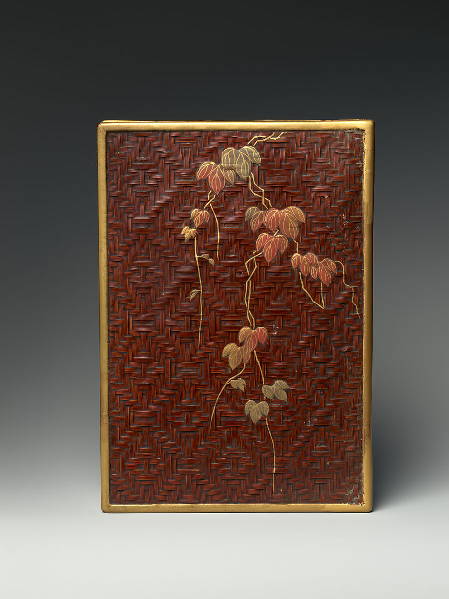 The lid of this document box features fine strips of bamboo covered in lacquer and then decorated with a stylized autumn ivy vine design. A similar ivy motif appears on a silver Tiffany teapot (combined with a dragonfly) made about 1878; an early inventory suggests that Moore may have acquired this box that year at the Paris Exposition. A box like this is also mentioned in discussions of the colors Tiffany aspired to create in the Conglomerate Vase.