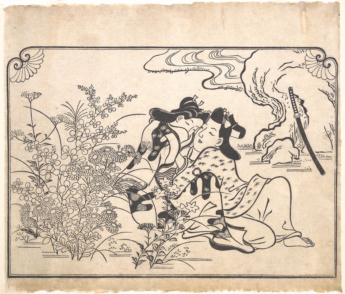 Moronobu's recurrent depictions of lovers in amorous poses allowed him to merge graphic and emotive qualities. Their physical and lyrical integration is heightened by the sinuous, animated lines and the play of the black and white patterning in the robes. As if to suggest the completeness of each sheet, the prolific book illustrator Moronobu framed the composition with a black-line border embellished with chrysanthemum-like ornaments at the upper corners.