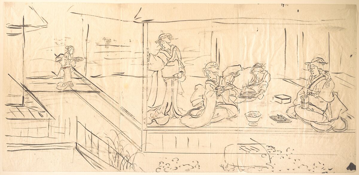- Medium: Preliminary sketch for drawing intended as design for woodblock print; ink on thin paper