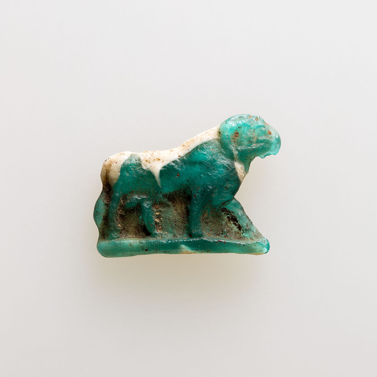 Starting in the later Late Period and continuing through the Ptolemaic Period, a type of glass amulet cast by pressing the glass into a shallow open mold appears. The back was left rough, and the amulets may look ragged because glass overflowed the mold around the edges. The earlier amulets are monochrome, bi- or multicolor amulets supplement the repertoire during the Ptolemaic Period.