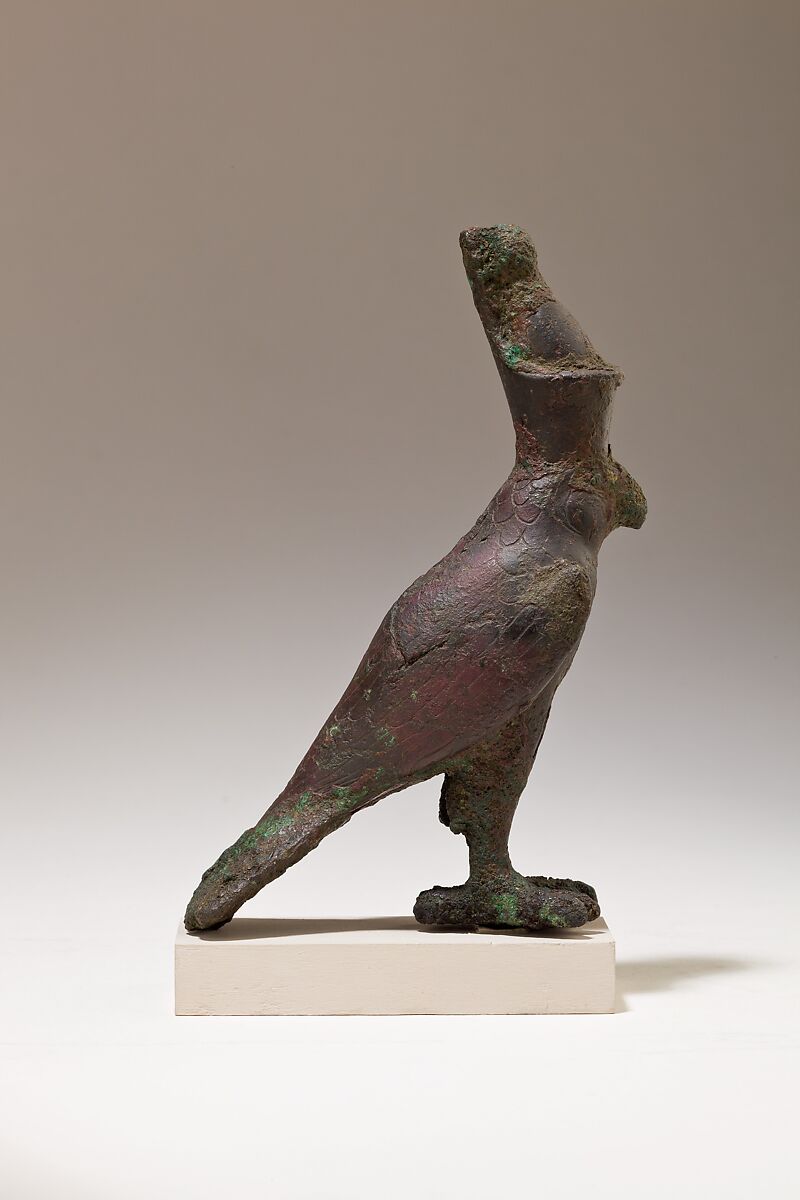 The falcon god Horus stands with his wings swept back. He wears the double crown of Egypt, a royal crown that symbolizes the union of Lower and Upper Egypt, and highlights Horus’ role as the legitimate ruler of the entire land. The falcon wears the double crown because Horus and the concept of kingship were closely tied, as early as the Predynastic Period. Despite corrosion, this falcon preserves some careful detail including the falcon’s facial markings, as well as the long and short feathers of the body.