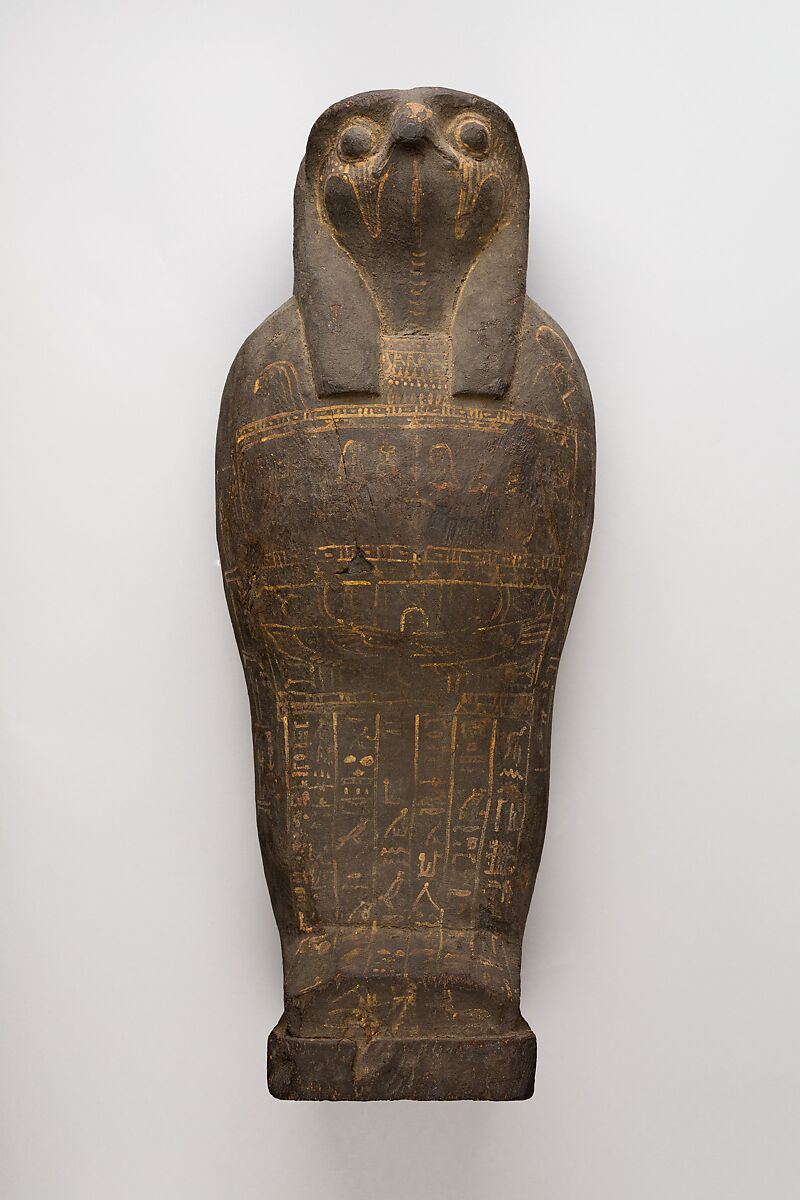 These falcon-headed coffins do not contain actual mummies but symbolic Osiris mummies stuffed with grain and sand. The falcon head on the coffins and the hieroglyphic text on the painted lid indicate they are associated with the funerary deity Ptah-Sokar-Osiris.