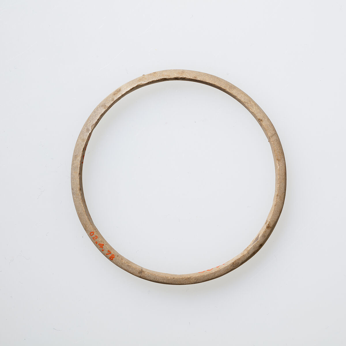 Flint bangles such as this one are mainly found in burials. The deceased often wore multiple bangles together, on one or both forearms. These items were in use for a relatively short time, only during the Early Dynastic period, and most examples date specifically to the First Dynasty. They were made through a combination of flaking and grinding. Flint bangles were extremely difficult to produce and demonstrate the exceptionally high degree of expertise achieved by Egypt’s flint knappers. They also show that Ancient Egyptians used flint for personal adornment and display, not just to make implements needed for utilitarian and subsistence purposes.