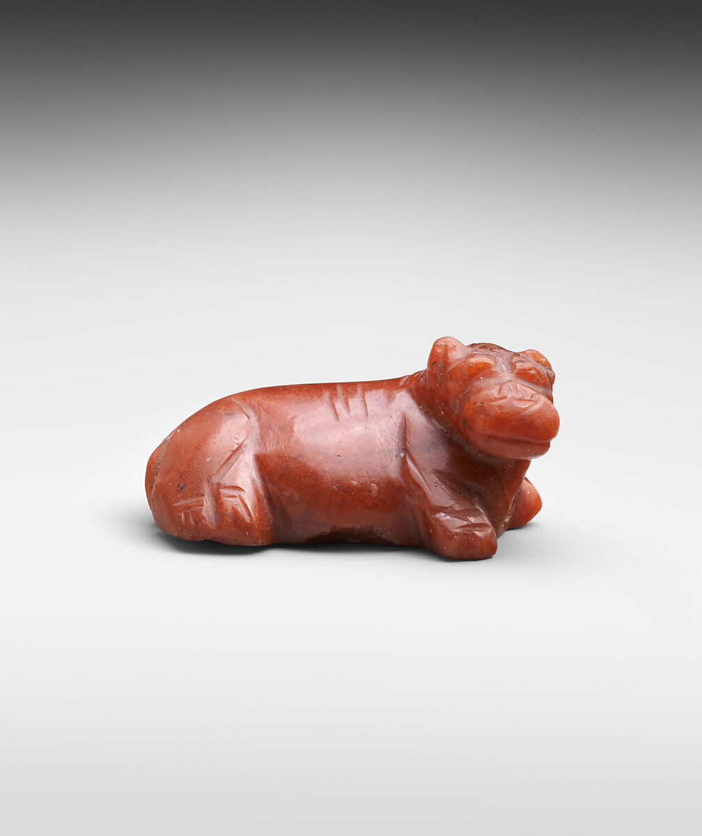 This tiny reclining hippo is masterfully carved from red jasper, a material that is typical for the New Kingdom. Pierced lengthwise, it might have been used as a piece of jewelry or as an amulet. Ancient Egyptians believed that hippopotami were very dangerous animals, but they also associated hippos with positive qualities such as life, regeneration, and rebirth.