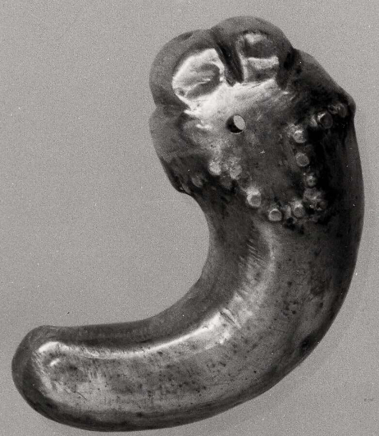 Comma-shaped ornaments were attached to gold crowns as well as strung with glass beads to create elaborate necklaces and chest decorations. Gold earrings were worn by both men and women during the Three Kingdoms period and are the most prevalent type of jewelry found in tombs. The jewelry was made using a variety of goldsmith techniques, from simple hammering to the more complex method of granulation, in which tiny gold beads are adhered to the surface to create intricate designs.