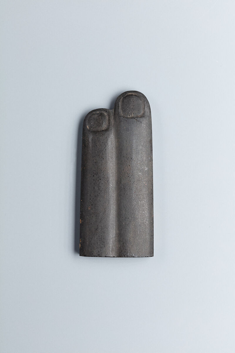 Two-finger amulets were used exclusively for the dead and were often found on the lower left of the torso. This is the area of the embalming incision, which was made during the mummification process. These amulets were meant magically to heal the wound. The first examples of this amulet type date to Dynasty 26. Their preferred material was obsidian or other dark stones.