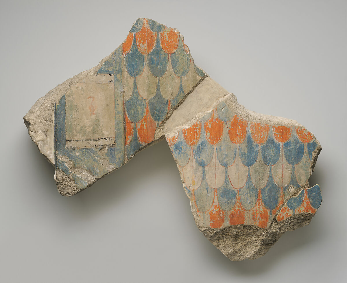 This painted relief depicts part of a throne with a feather pattern. Two fragments (X.631.3 and 2006.82.1) have been joined here.