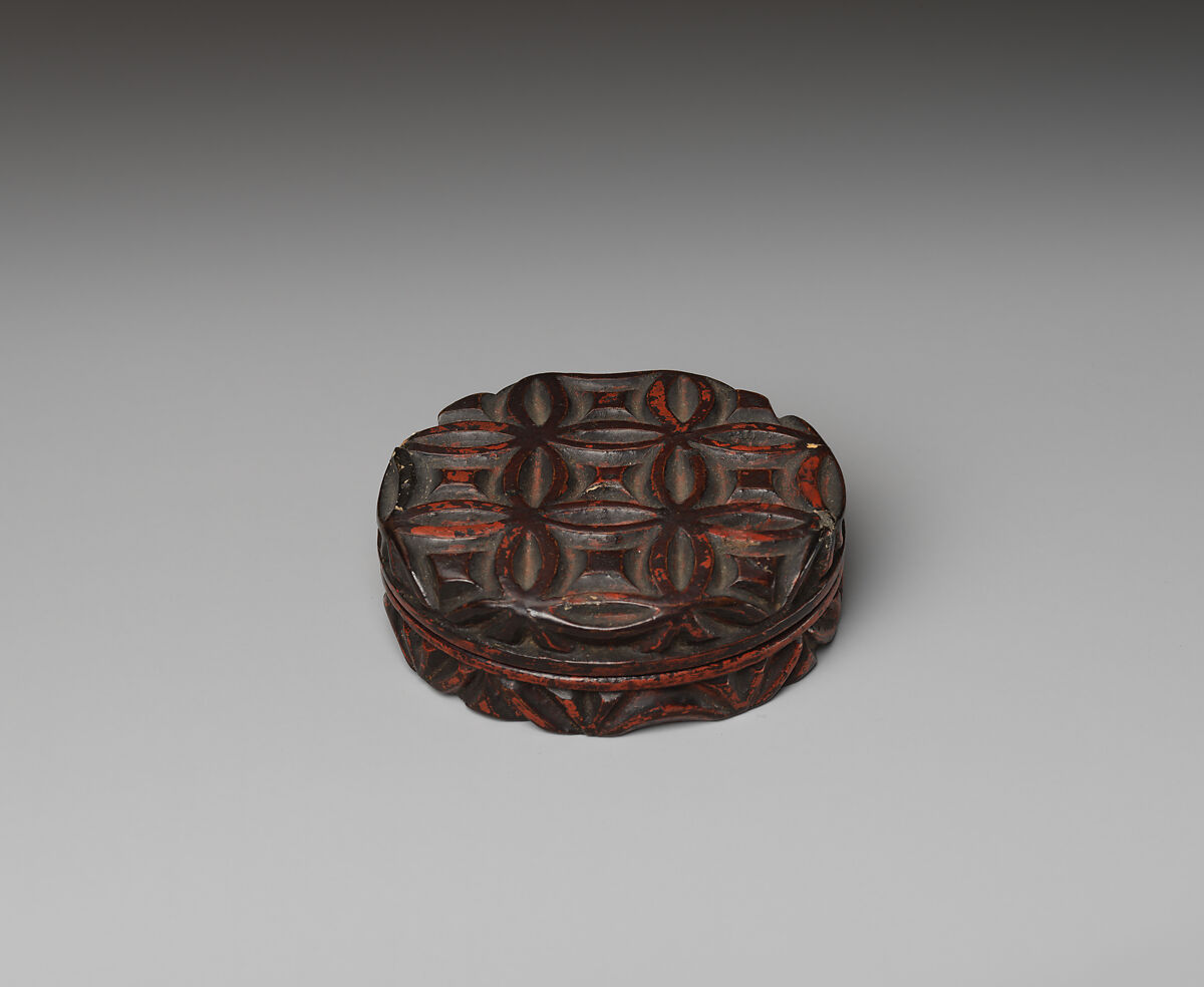 Japanese artisans developed “Kamakura carving” in the Muromachi period (1392–1573) to imitate Chinese carved lacquer. In this technique, patterns are carved into wood and then coated with layers of red and black lacquer. The incense box here has an auspicious pattern of interlinked circles (shippō) in a continuous, chainlike motif that symbolizes prosperity and continuation. Moore often used the pattern to embellish silverware.