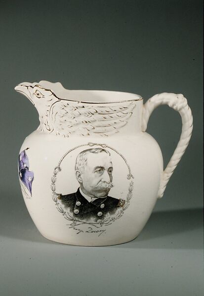 This white earthenware pitcher has a globular body and a straight-sided neck. An eagle is molded under, and acts as, the spout. A transfer-print of Admiral Dewey, commemorating his victory at Manila, decorates the front of the body. One molded handle done in a rope pattern, extends from the shoulder to the body of the pot.