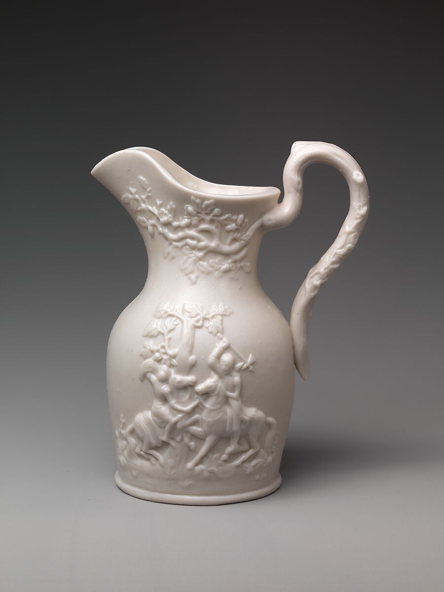 The design in low relief on this Parian pitcher is called a "Love and War" motif. On one side, two knights fight on horseback; on the other, a man serenades a lady on horseback. The original source for this design is attributed to Alcock and Company of England.