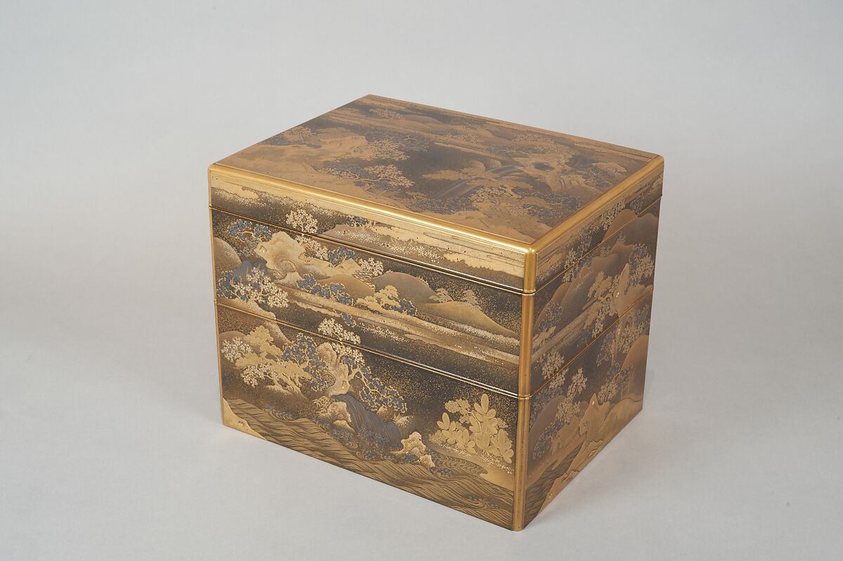 This box with two compartments and an interior tray would have contained incense and the implements used in the traditional game of discriminating different fragrances of incense. Its landscape decoration of rolling hills covered with flowering cherry trees and a swift-flowing stream are motifs associated with the Yoshino mountains south of Nara, long celebrated in Japanese art and poetry.