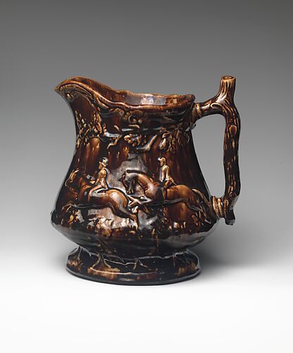 The pitcher bears a hunting scene in relief on one side which includes stag, rabbits, bird of prey, cat and wild boar; the other side bears an American eagle pulling the tail out of a British lion. The body is covered in a mottled brown and cream "Rockingham" glaze.