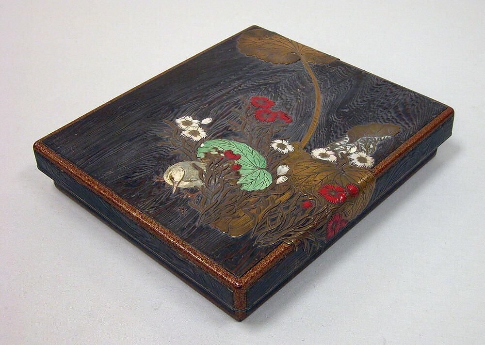 - Medium: Colored lacquer, gold maki-e, and inlaid pewter