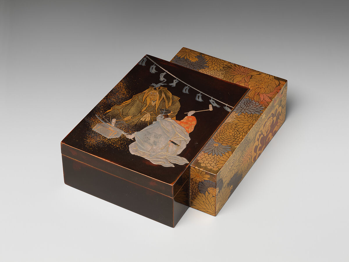 The cover and inside tray illustrate a famous Noh play based in the late tenth and early eleventh centuries. In the play, the emperor receives an oracle in a dream and the famous sword maker Kokaji forges a sword with the help of a Shinto deity. This deity appears as a fox; however, on the cover of the box, both figures are shown in human form. An inscription on the bottom of the box indicates that it was produced in the style of Koma Kansai II (1767–1835) by one of the many artists who worked in this tradition and often used the name of the original master.