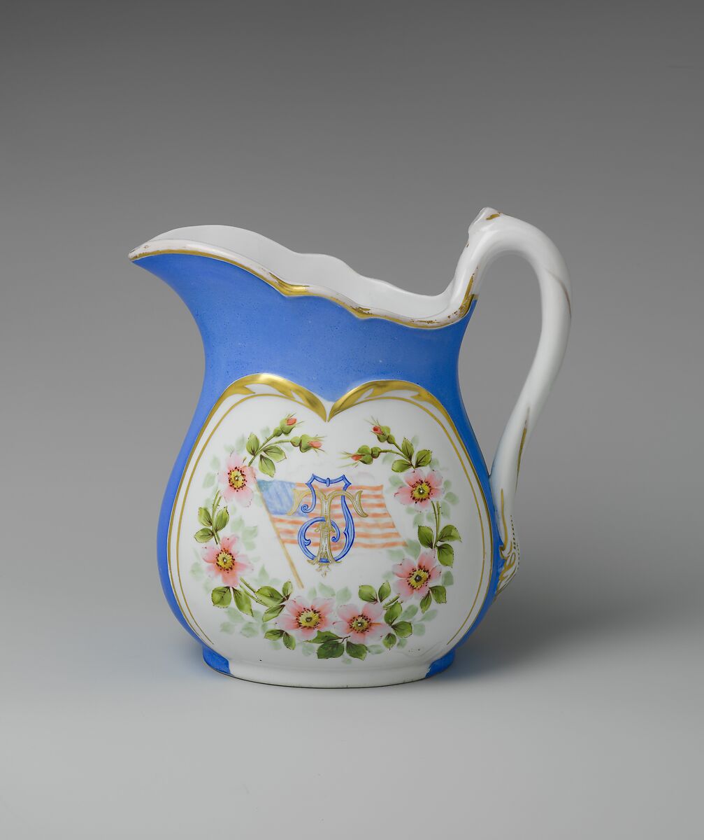 This pitcher represents Greenwood Pottery's attempt to manufacture and decorate pieces that could compete with European imports. Incorporated in 1868 under the direction of English immigrant James Tams, Greenwood produced refined white earthenwares for domestic use. Shortly after the Philadelphia Centennial Exhibition in 1876, the firm developed a vitrified ceramic body, which they called "American China." Tams aggressively marketed the new ceramic and used it for hardware trimmings, telegraph insulators, and hollow wares. This pitcher, with reserves enclosing a bouquet of pansies on one side and the initials JT and an American flag on the other, may have been made for Tams.