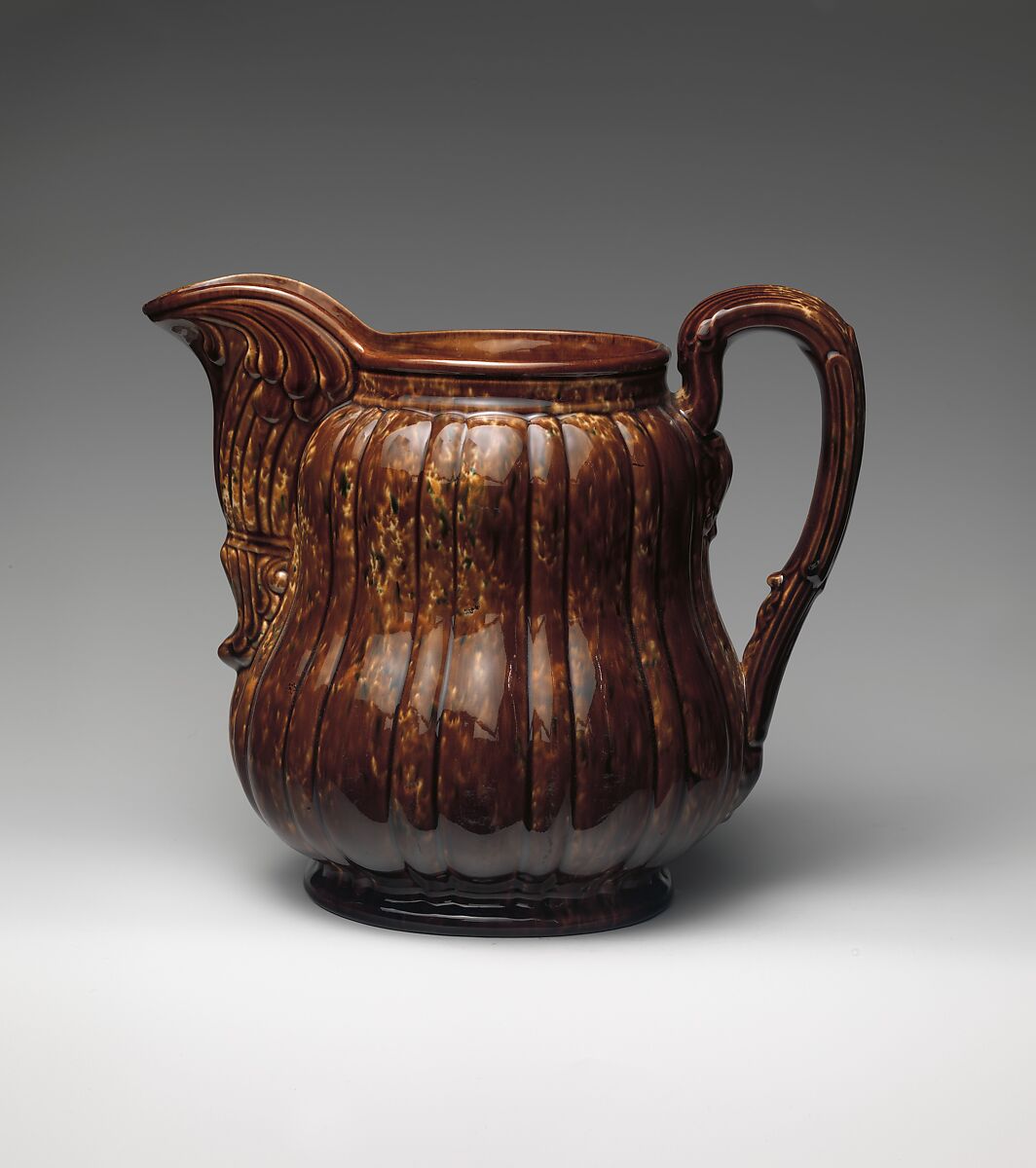 This pitcher is covered in a speckled flint enamel glaze of brown, yellow and blue-green.