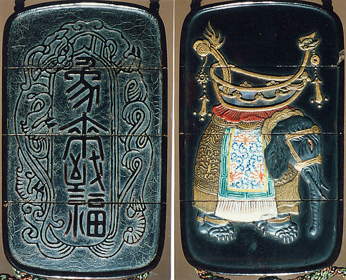 - Title: Case (Inrō) with Design of Caparisoned Elephant (obverse); Characters in Panel (reverse)