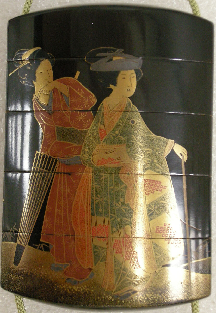 - Title: Inrō with Woman and Attendant; Man Reading Characters on a Stone Road Marker (reverse)