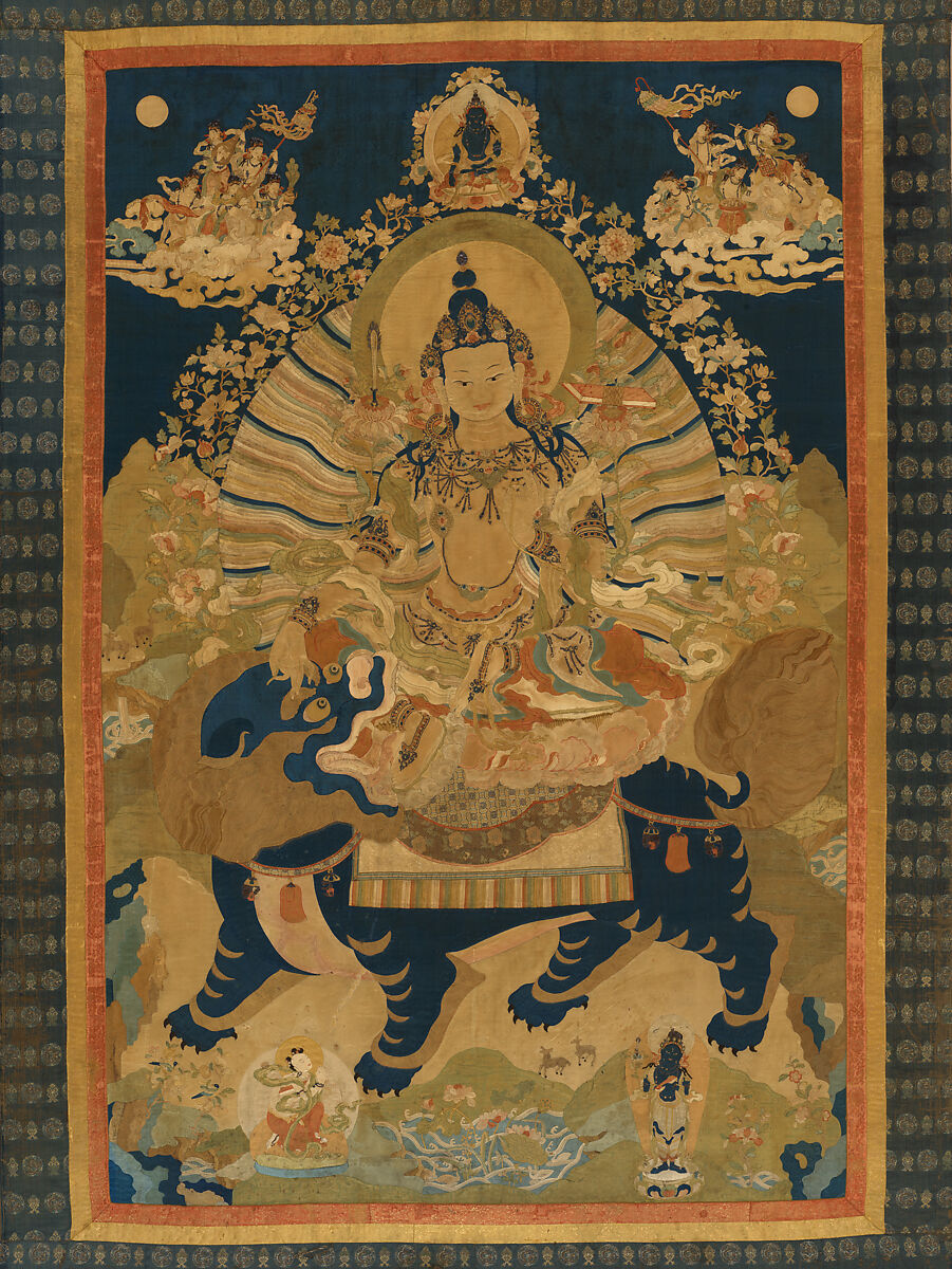 This monumental appliqué shows Manjushri with his identifying attributes—a sword and book on adjacent lotuses—riding a blue lion. Manchu rulers, especially Emperor Qianlong (r. 1736–95), revered this bodhisattva; the Suzhou imperial workshop likely fabricated the piece as a gift to a Tibetan monastery. Various silks were used: silk strips to suggest the volume of the folds in his garment and couched silk cords to delineate the lion’s mane and tail. Above, the blue Buddha Akshobhya attests to Chinese familiarity with Tibetan conventions. At lower left is the pilgrim Sudhana, the ideal devotee who receives teachings from Manjushri.