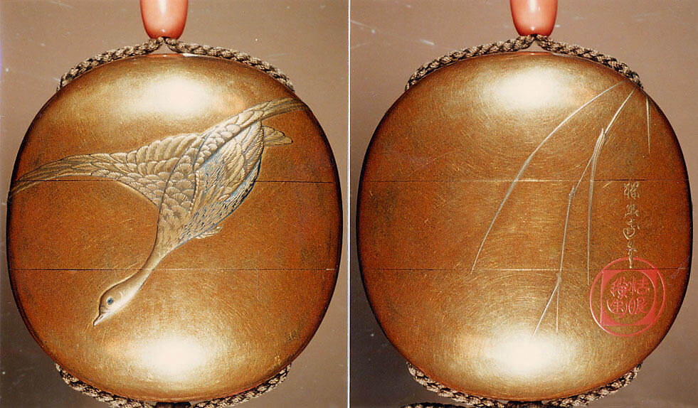 - Title: Case (Inrō) with Design of Goose Flying Down (obverse); Inscription and Seal beside Reeds (reverse)