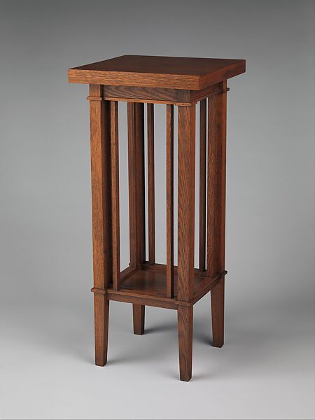 These two plant stands (1972.60.11,.12) were made for the Peoria house and are identical to a set that can be seen in photographs of the house Wright designed for Susan Dana in Springfield, Illinois (1902). While Wright designed unique, built-in furnishings for many of his domestic interiors, he appears to have created a standard set of moveable furnishings to be included in many of his Prairie Style commissions.