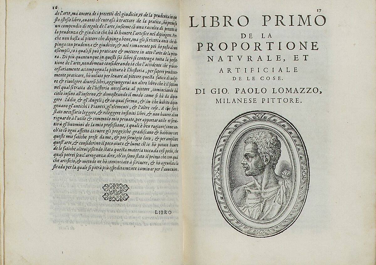 Illustrated: book 1, title page, woodcut portrait of Lomazzo