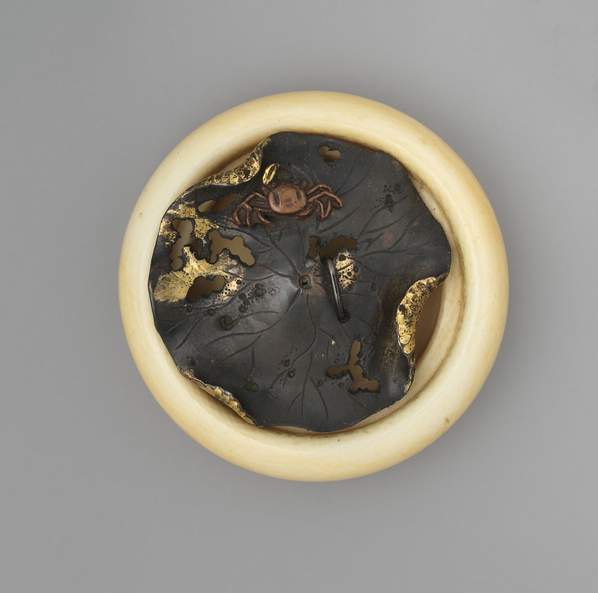 - Medium: Ivory body, patinated copper disk with mixed-metal and gilded details