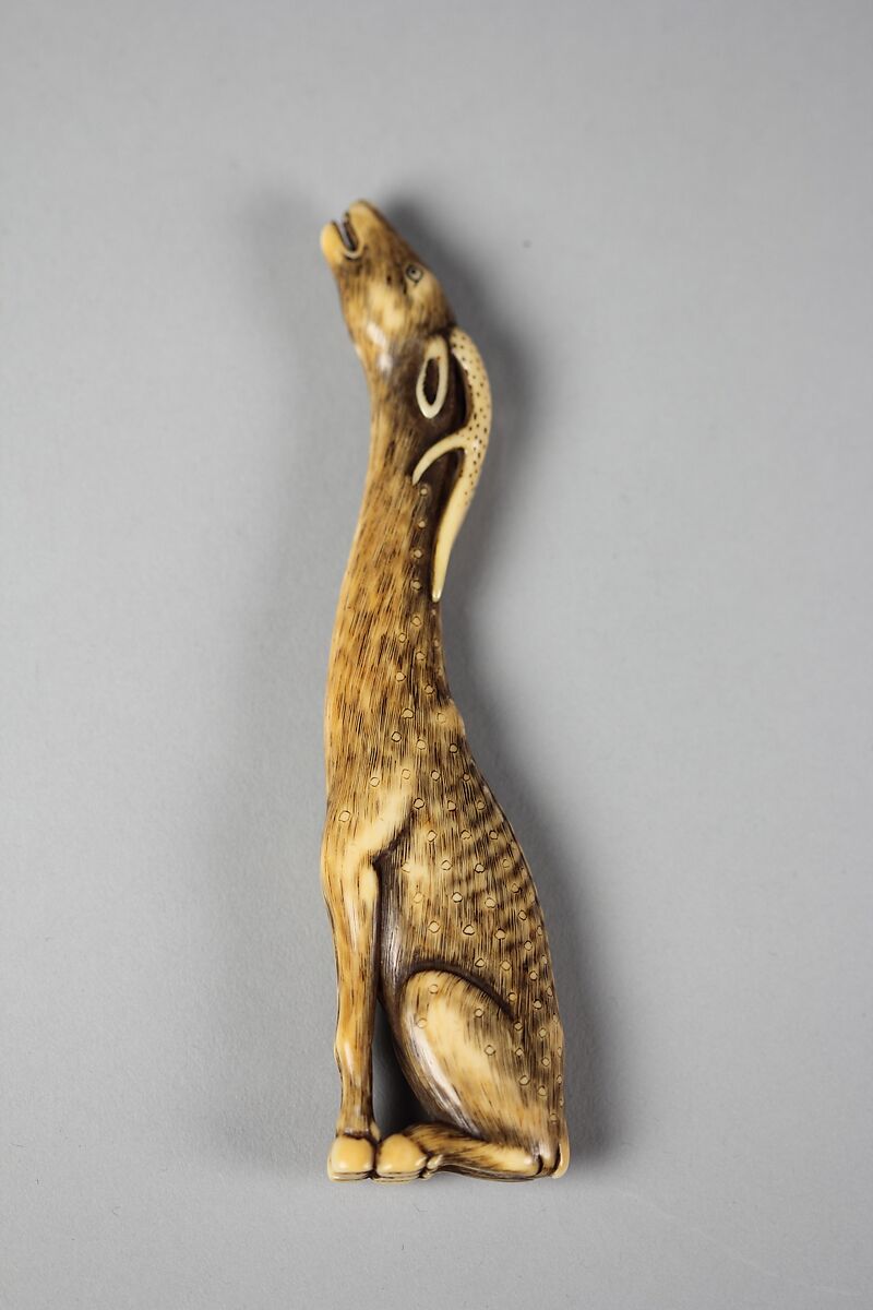 The fine hairs and spots on the back of the stag are carved with great detail. An emphasis is placed on the elongated curved neck and arched back of the animal, represented squatting.