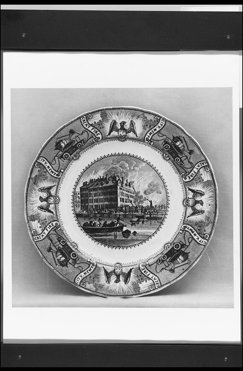 This black and white transfer-printed earthenware plate made possibly by the Staffordshire firm of Thomas Dimmock & Co. features a view from Coenties Slip of the burning of the Merchant's Exchange in the "Great Fire of New York." The Exchange was designed and built in 1824 by New York architect Josiah R. Brady (ca. 1760–1832) and his partner Martin E. Thompson (1789–1877). The fire that destroyed the building began the night of December 16, 1835 on the corner of Merchant (Hanover) and Pearl Streets and raged throughout the next day as efforts to extinguish the fire were hampered by negligence of fire companies, inadequate water supplies and freezing cold temperatures. Nineteen hundred firefighters from as far away as Philadelphia battled the blaze. Causing more property damage than any other fire in city history, the fire destroyed 674 buildings in the more than twenty-block area east of Broad Street and south of Wall Street that comprised the heart of New York's wholesale and merchant district. Local merchants suffered over twenty million dollars worth of losses bankrupting nearly all of the city's fire insurance companies. Among the buildings destroyed, the marble-facaded Merchant's Exchange built in the Greek Revival style from 1825 to 1827 was considered one of the city’s finest structures; its burning represented a monumental loss. The view of the burning of the Exchange on the plate was based on a lithograph titled "View of the Great Conflagration of December 16th and 17th, 1835; from Coenties Slip" by John Henry Bufford (active 1835–1871), one of the nineteenth century's leading American lithographers. Bearing the inscription "N. Currier's Lith. No. 1," the lithograph was published by the period's other great lithographer, Nathaniel Currier (1813–1888) with whom Bufford had apprenticed in the Boston lithography shop of Pendleton and Company (1825–1836). The view is one of three depicting the burning of the Exchange with borders illustrating fire equipment and winged phoenixes amidst flames separated by scrolls inscribed "THE GREAT FIRE OF / THE CITY OF NEW YORK." The other two views are titled "Burning of the Merchant’s Exchange, New York" and "Ruins, Merchant's Exchange." A plate, 14.102.180, with the latter view is in the American Wing's collection. Both plates are marked on the back with the printed initial "D," a mark known to have been used by Thomas Dimmock & Co. Refer to the Dictionary for a definition of the term "transfer printing" and for information about Dimmock.