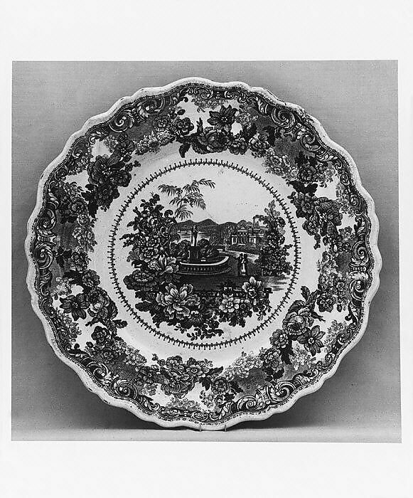This brown and white transfer-printed earthenware plate made by the Staffordshire firm of James & Ralph Clews features a view from a series of four views of country estates known as "Virginia" designed specifically for the American export market. The series title may refer to the geographical location of the estates pictured or to the particular United States market for the series. The source of the views is unknown and the estates may all be imaginary. Each view is framed in the foreground by flowers strewn across meandering latticework. The present view depicts a man and two women standing in front of a statue surrounded by a semi-circular stone balustrade. A river flows in the middle distance in front of a two-storey mansion built in the Greek Revival style typical of the first half of the nineteenth century in America. The series border consists of outer foliated scrolls and inner clusters of flowers. The American Wing's collection also contains additional pieces by Clews. Refer to the Dictionary for a definition of the term "transfer printing" and for information about Clews.